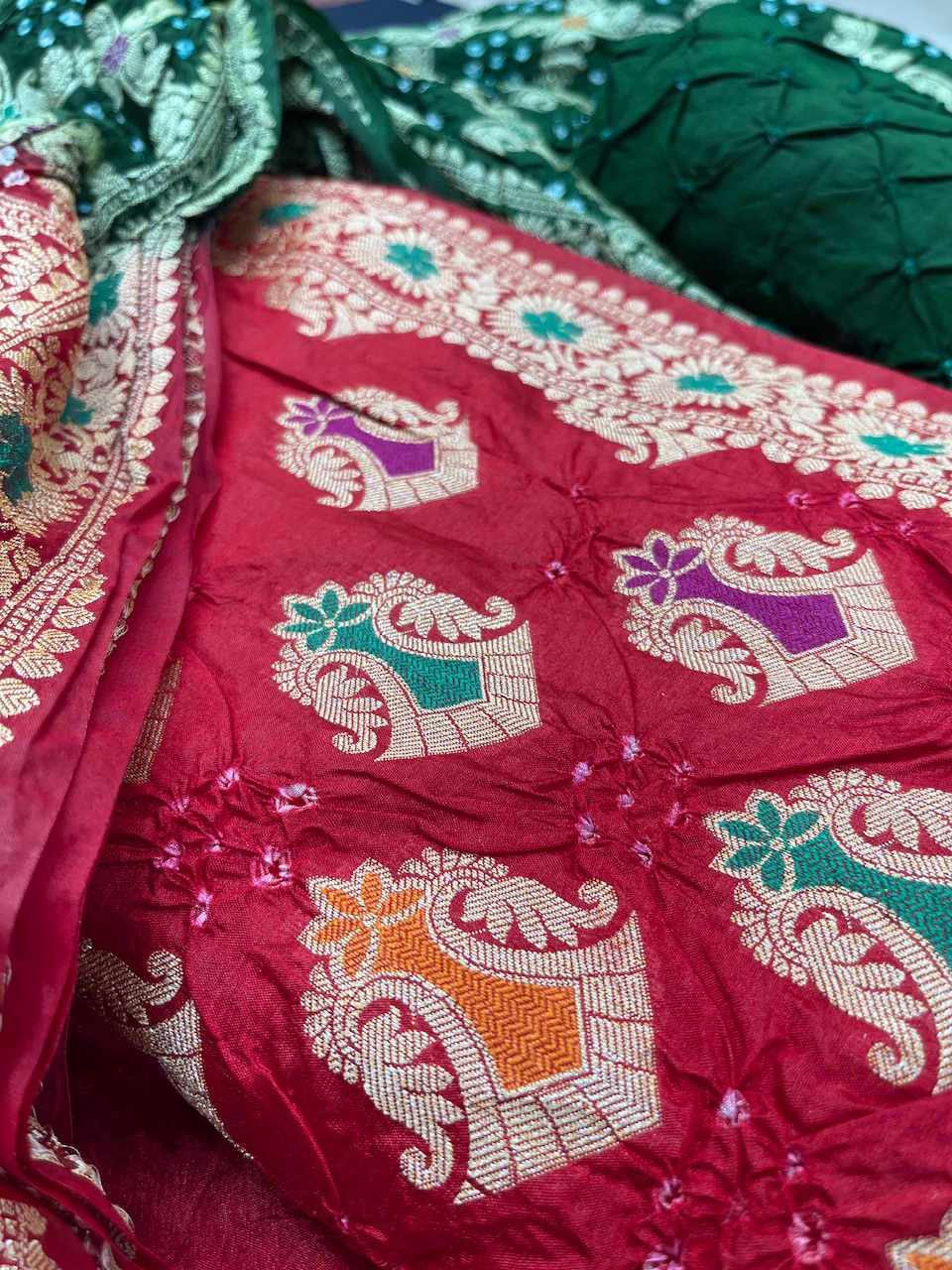 "Step into opulence with this luxurious combination of traditional textiles. Featuring a rich Bandhej green fabric adorned with intricate gold floral weaving and shimmering multicolored sequins, paired with a vibrant red fabric showcasing exquisite paisley and floral designs in bold tones of green, purple, and orange. Perfect for creating timeless ethnic ensembles, these materials showcase masterful craftsmanship and radiant elegance."