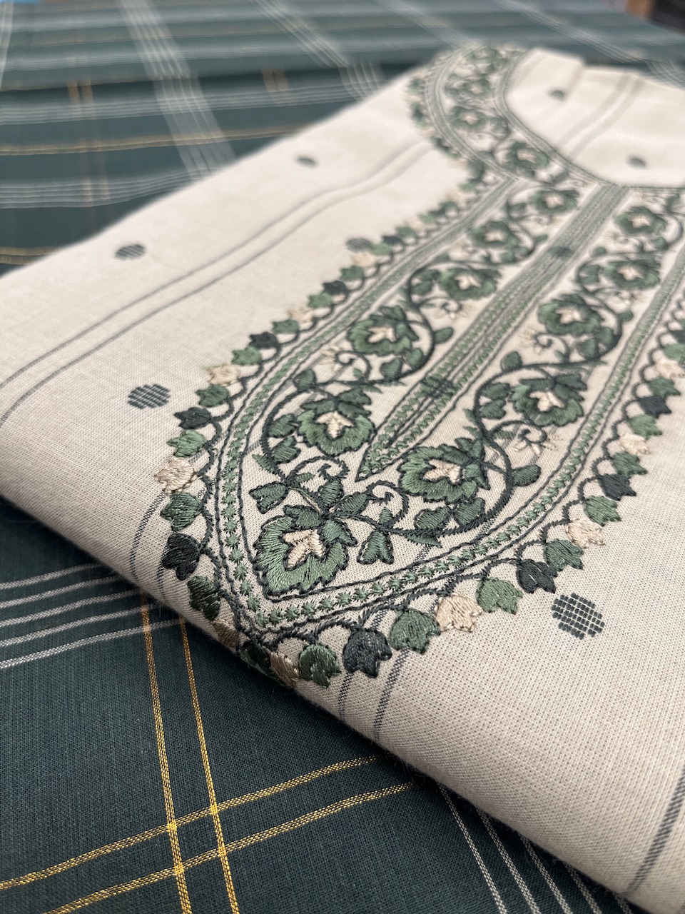 "Celebrate understated elegance with this beige dress material, adorned with intricate green and black floral embroidery. The subtle striped pattern with dotted accents adds a contemporary touch to the classic design, making it an ideal choice for creating a refined and stylish outfit suitable for any occasion."