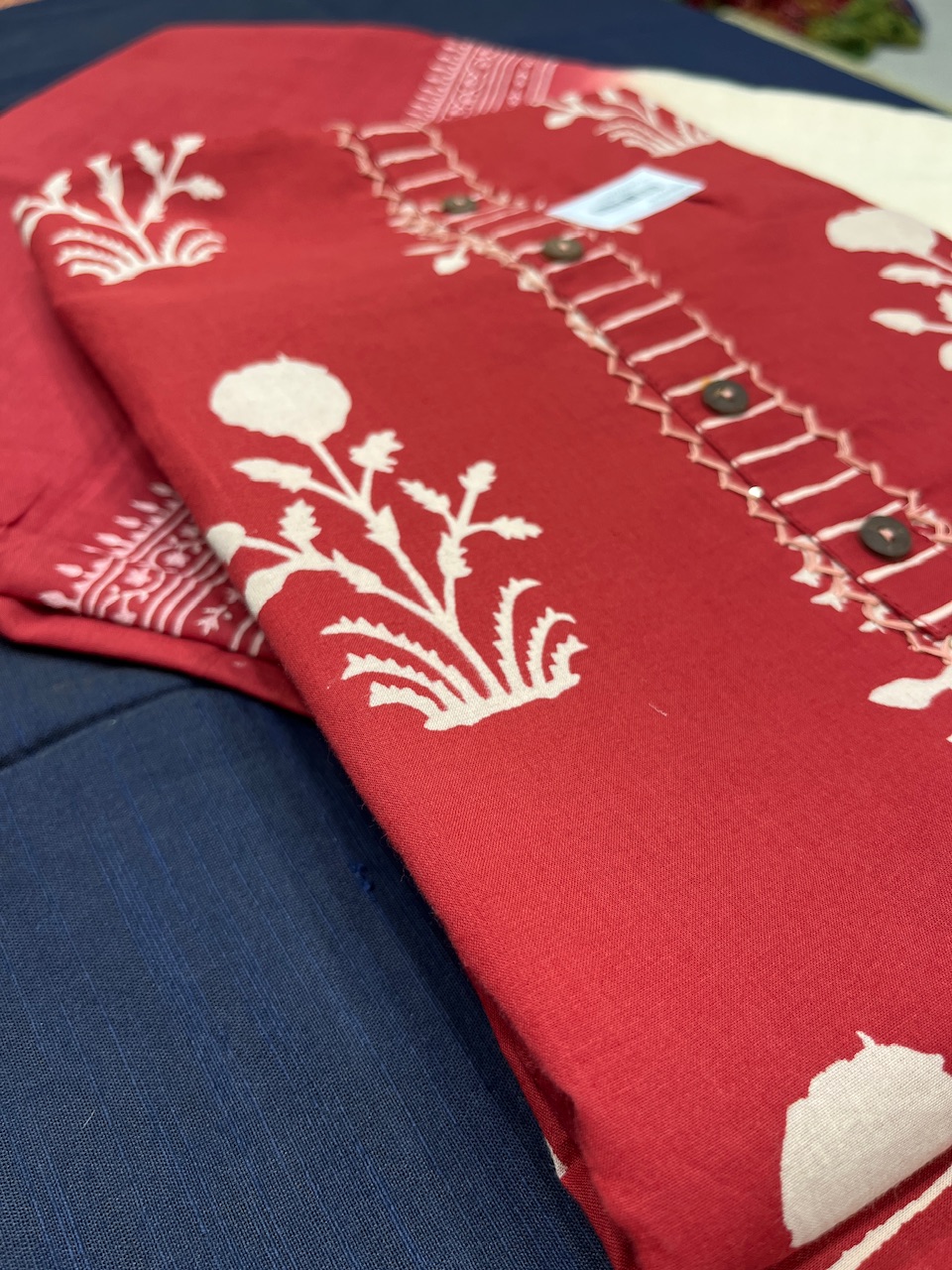 "Discover timeless beauty with this cotton dress material set, featuring rich red hues with intricate white floral and geometric motifs, perfectly paired with a light beige complement. Ideal for creating elegant, breathable ensembles with a touch of charm and tradition."
