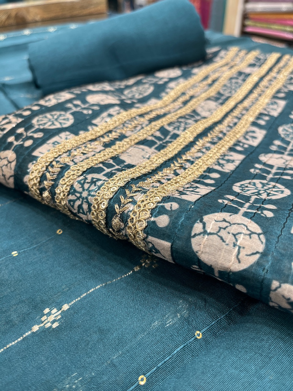 "Radiate grace and sophistication with this exquisite teal dress material, adorned with intricate golden and white embroidery. The delicate floral and geometric patterns lend a touch of regal charm, making it an ideal choice for creating an outfit that celebrates tradition with modern elegance."