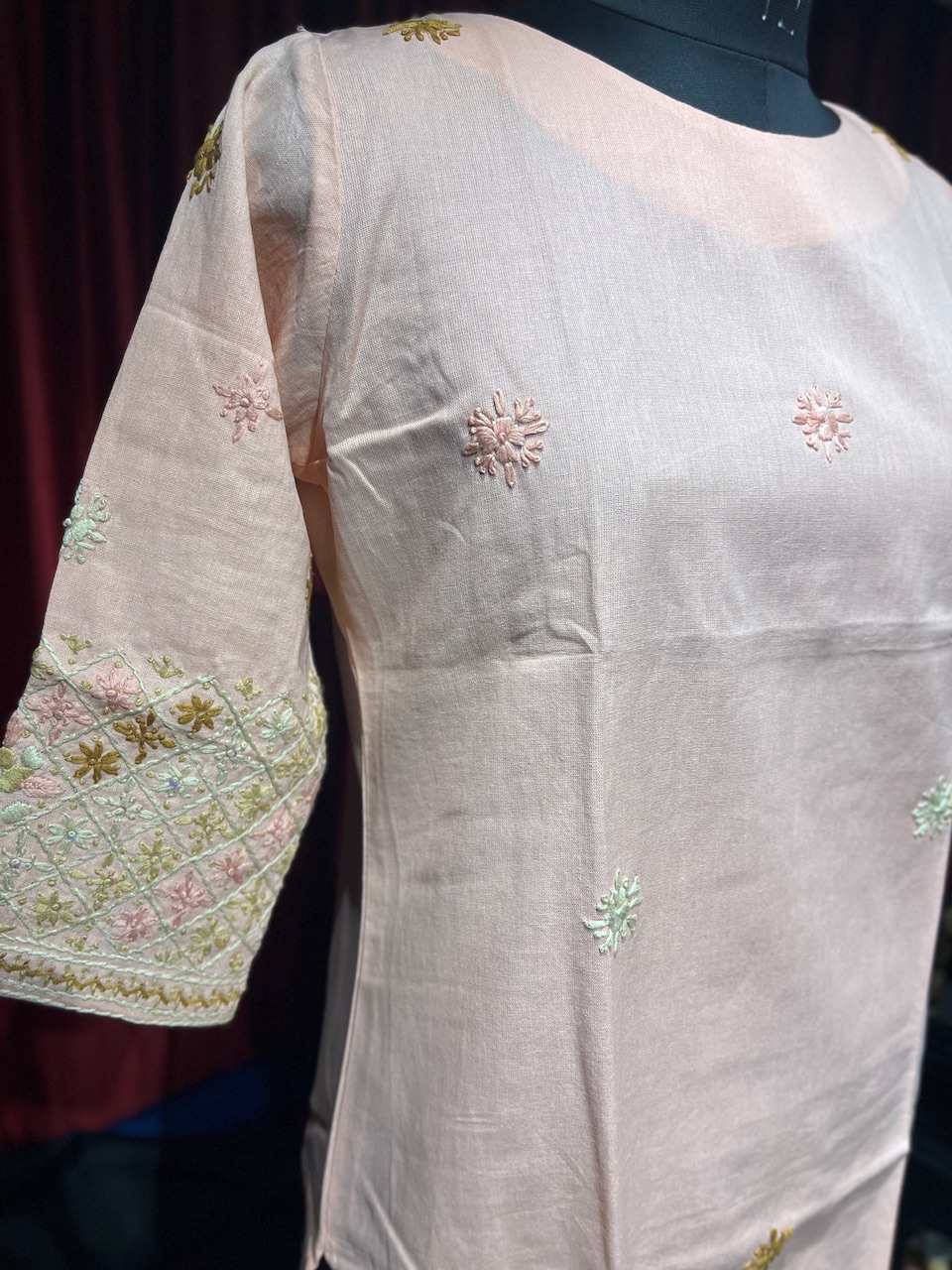 "Radiate elegance with our peach embroidered kurti, adorned with intricate floral designs in vibrant hues. Featuring a round neckline and three-quarter sleeves, this kurti offers a perfect blend of style and comfort for your everyday and semi-formal occasions."