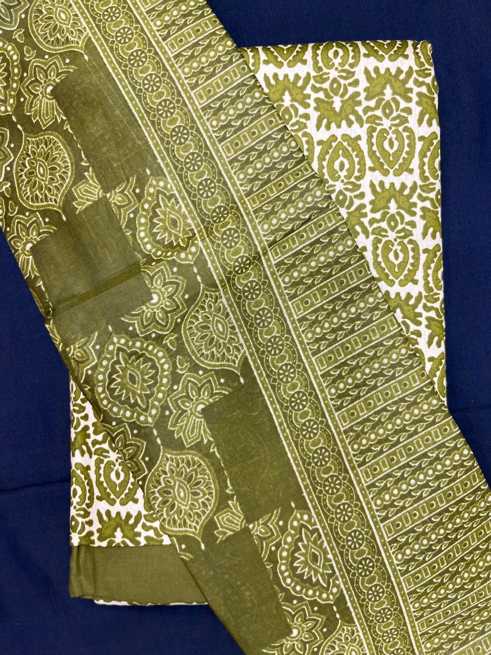 "Unveiling timeless elegance with our exquisite dress material, featuring intricate green and white floral motifs against a serene cream backdrop. Enhanced by a solid green border and complementary designs, this fabric embodies sophistication and charm—perfect for crafting stunning ethnic outfits for festive occasions and memorable moments."