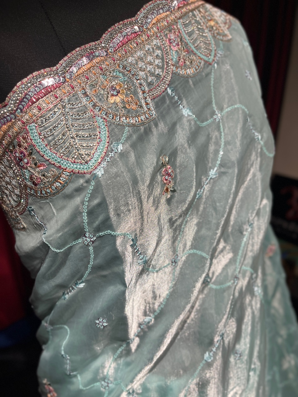 Radiating Glamour: This captivating aqua-blue party wear saree dazzles with its shimmering fabric, intricate embroidery, and beaded border. Perfect for special occasions, this piece exudes elegance and sophistication, ensuring you make a lasting impression.