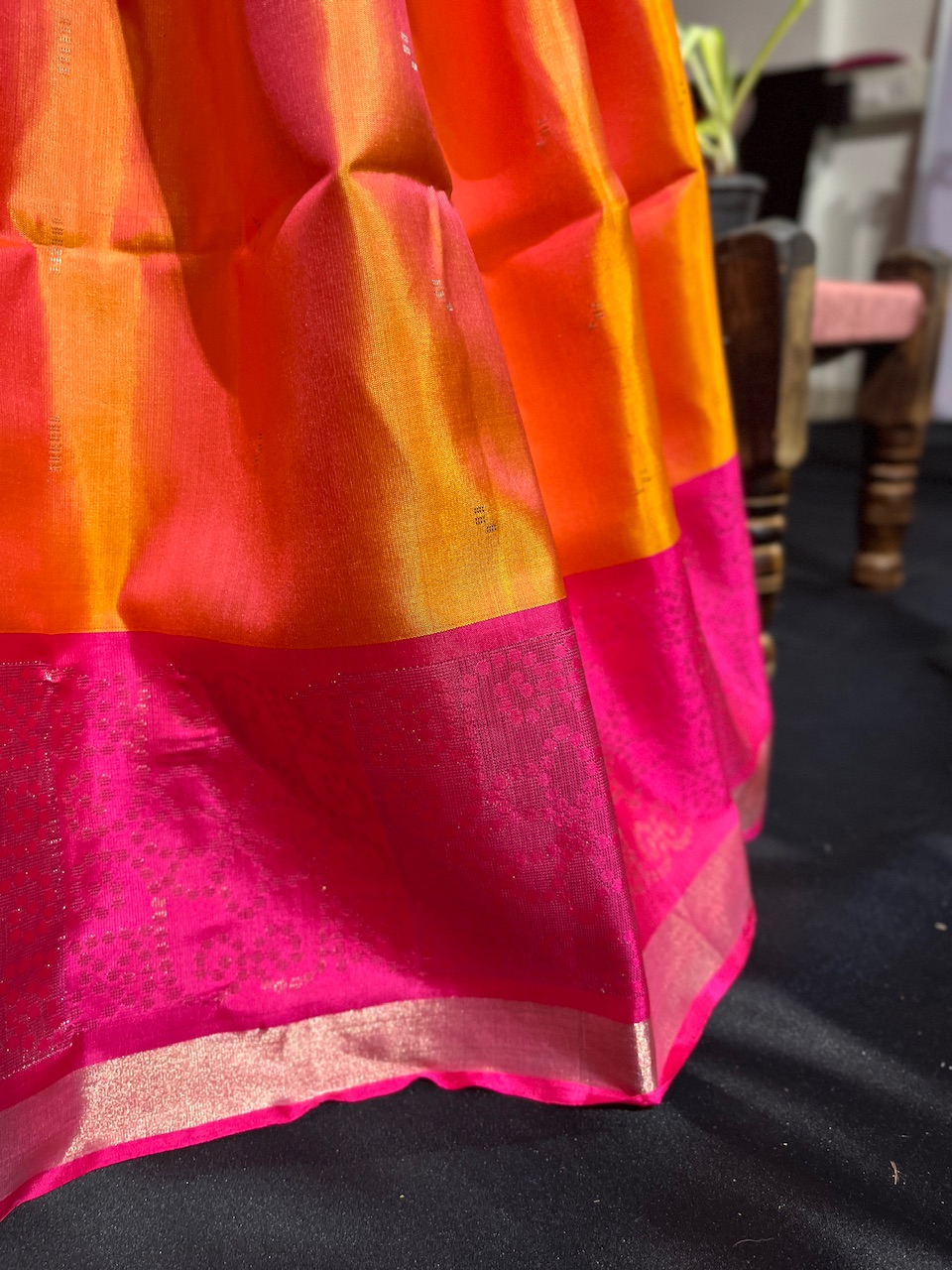 "Vibrant Pink and Orange Silk Saree with Golden Elegance—A Timeless Masterpiece for Festive Celebrations."