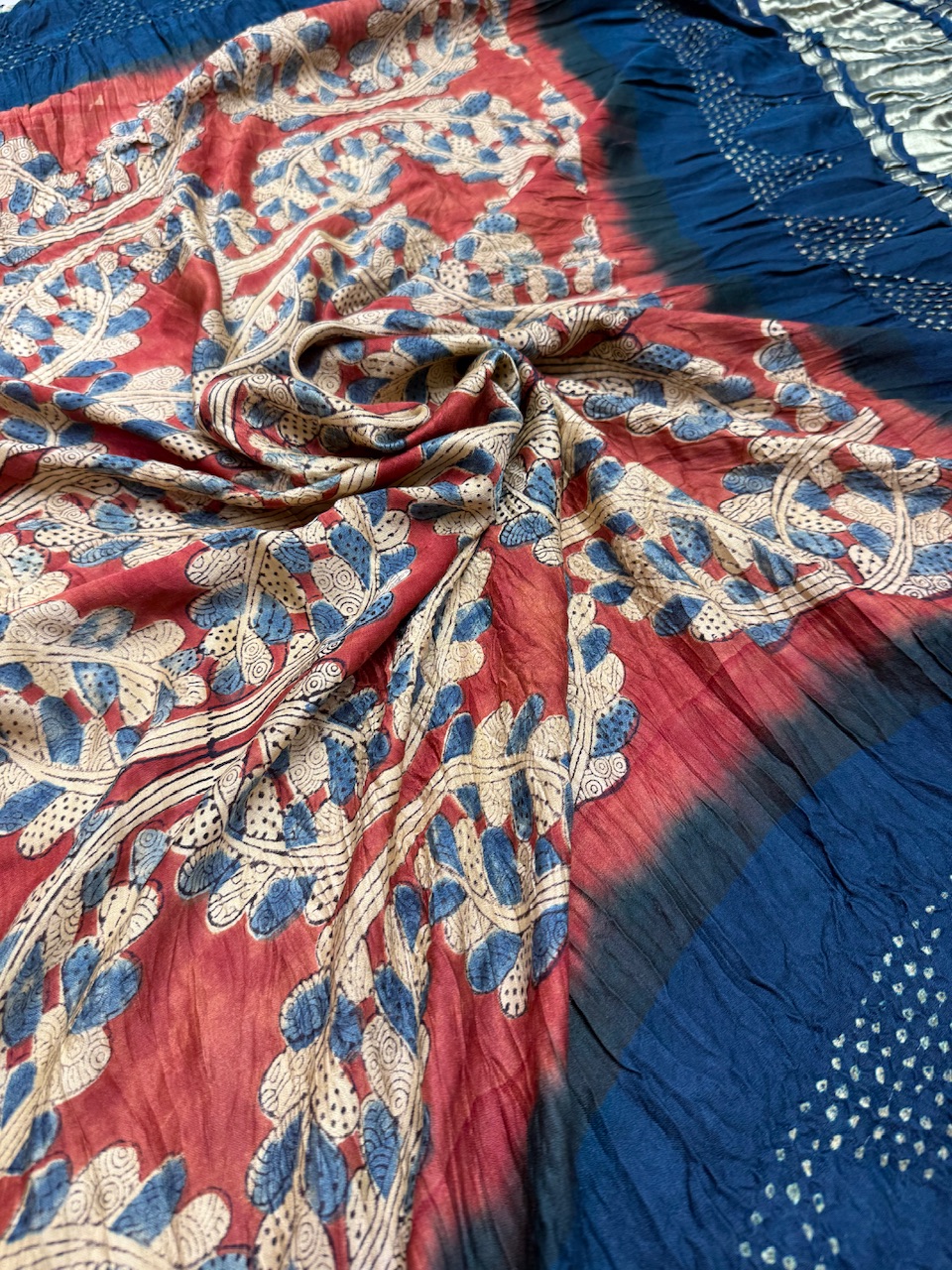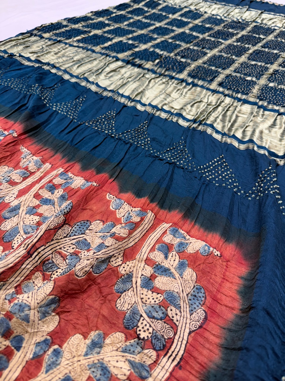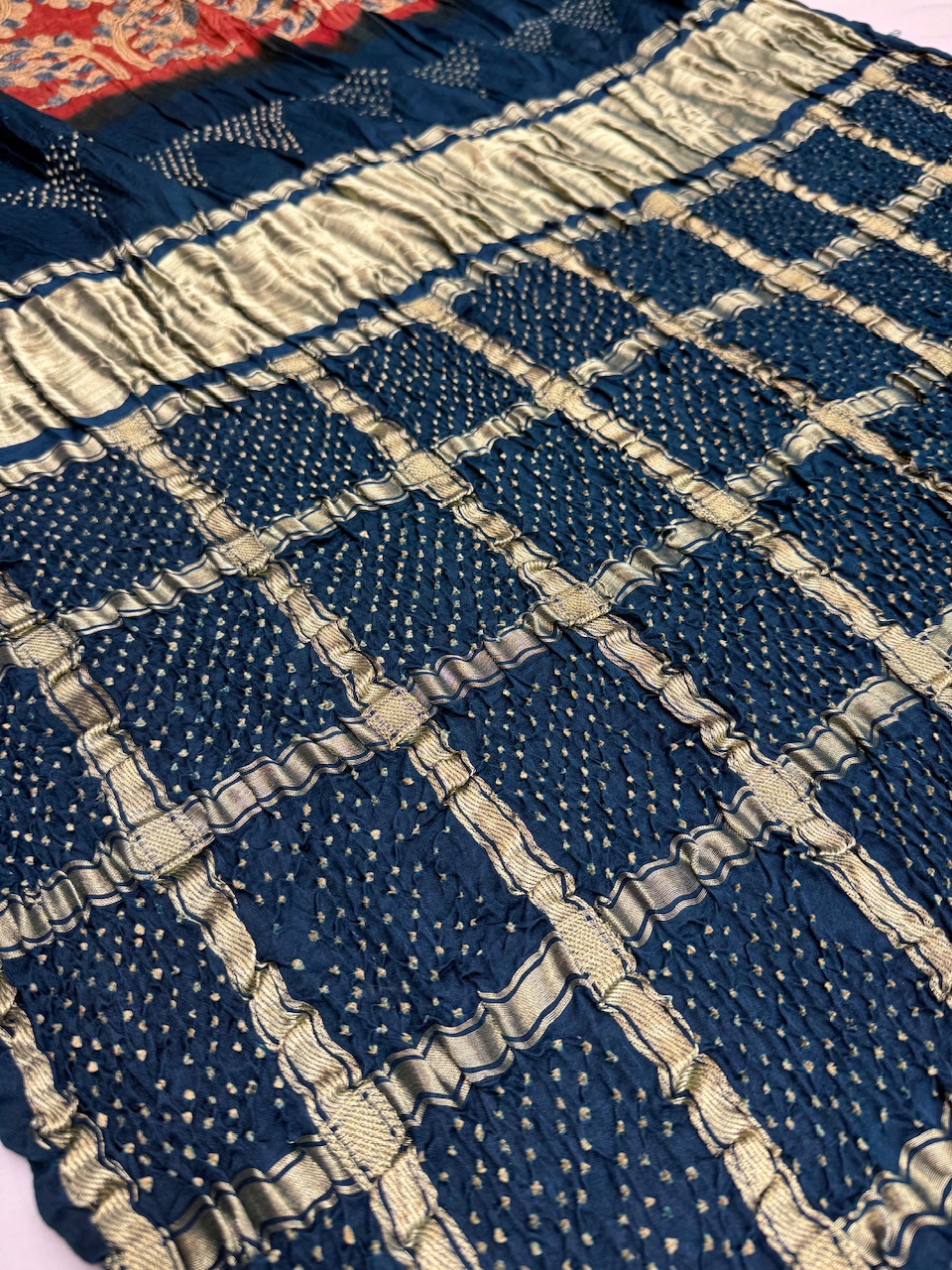 Pure handloom Gaji silk saree with Ajrakh‑printed body, Bandhani border, and Bandhani chex pallu.
