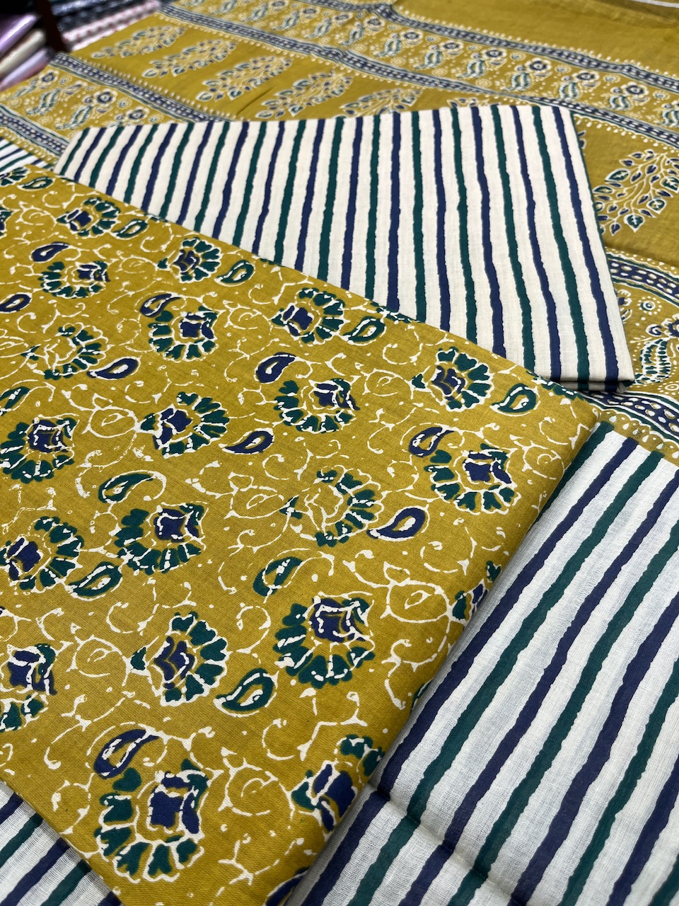 "Step into the world of timeless elegance with this Jaipur printed cotton dress material! Featuring a harmonious blend of black-and-white stripes, mustard yellow floral motifs, and intricate borders, this fabric captures the essence of traditional Rajasthani artistry. Perfect for creating an outfit that exudes charm and vibrant sophistication!"