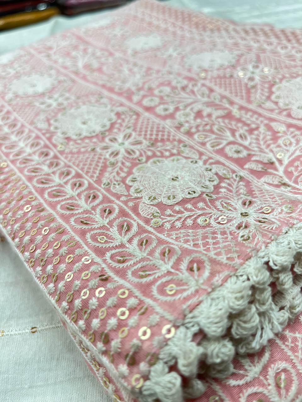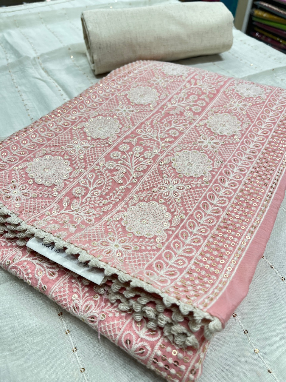 "Whispers of elegance! 🌸 This dress material presents a soft beige fabric alongside a vibrant pink piece adorned with exquisite white floral embroidery and geometric patterns. Perfect for crafting a timeless ensemble that radiates grace and charm."