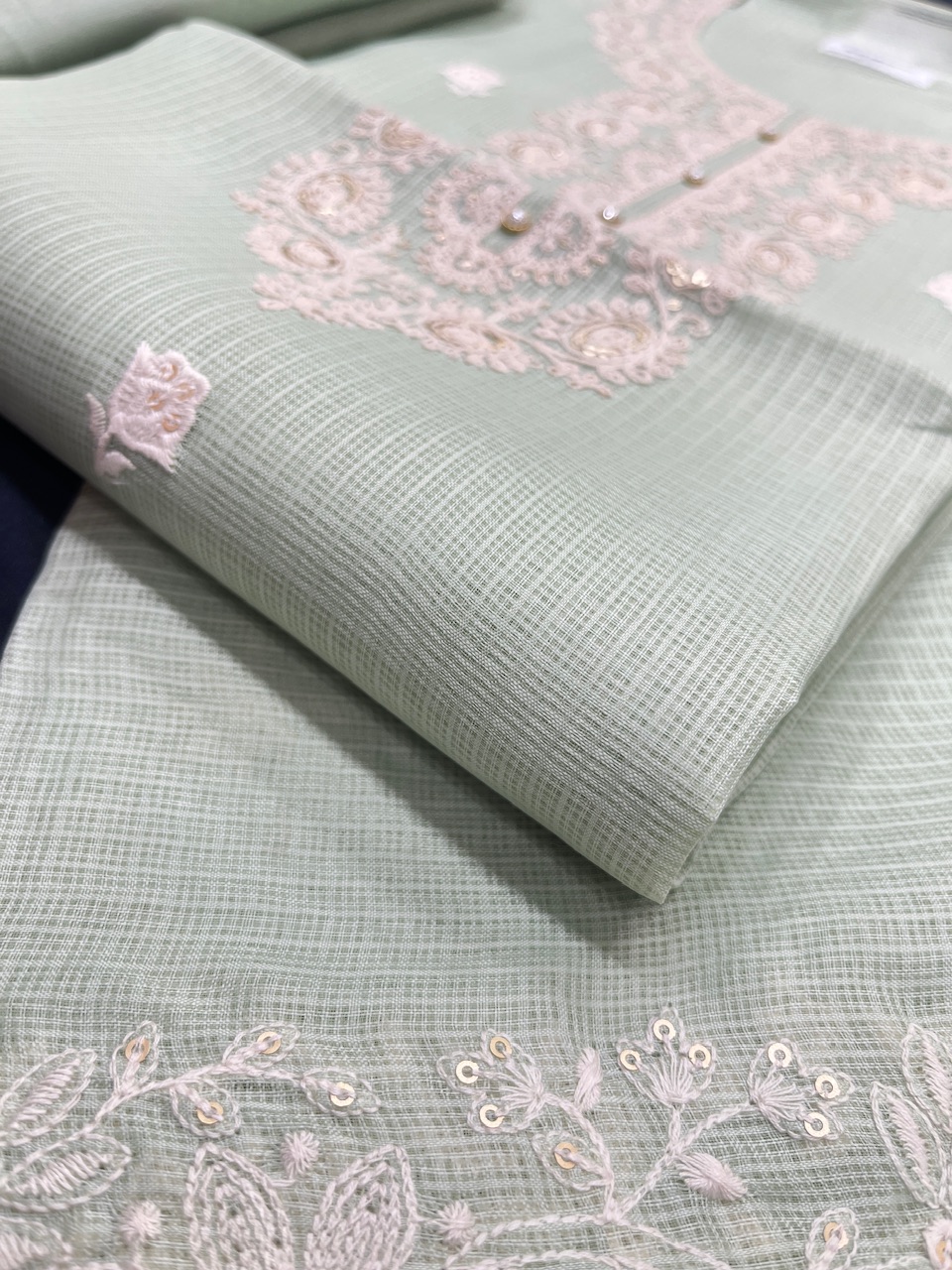 "Immerse yourself in elegance with this pistachio green dress material, featuring delicate floral embroidery that graces the neckline and borders with finesse. Enhanced by the timeless charm of its Jodhpuri dupatta, this ensemble is a testament to sophisticated craftsmanship and cultural artistry, perfect for any special occasion."