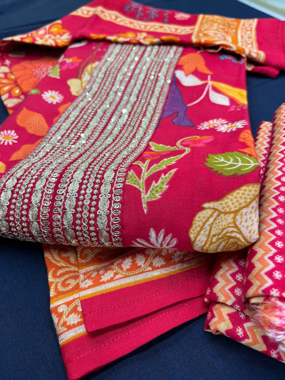 "Turn heads with this resplendent red dress material set, showcasing the artistry of floral and decorative motifs in vibrant hues of orange, pink, and yellow. Enhanced by shimmering silver sequins and a striking zigzag pattern, this ensemble blends tradition with contemporary allure—perfect for making a radiant statement at festive gatherings or celebrations."