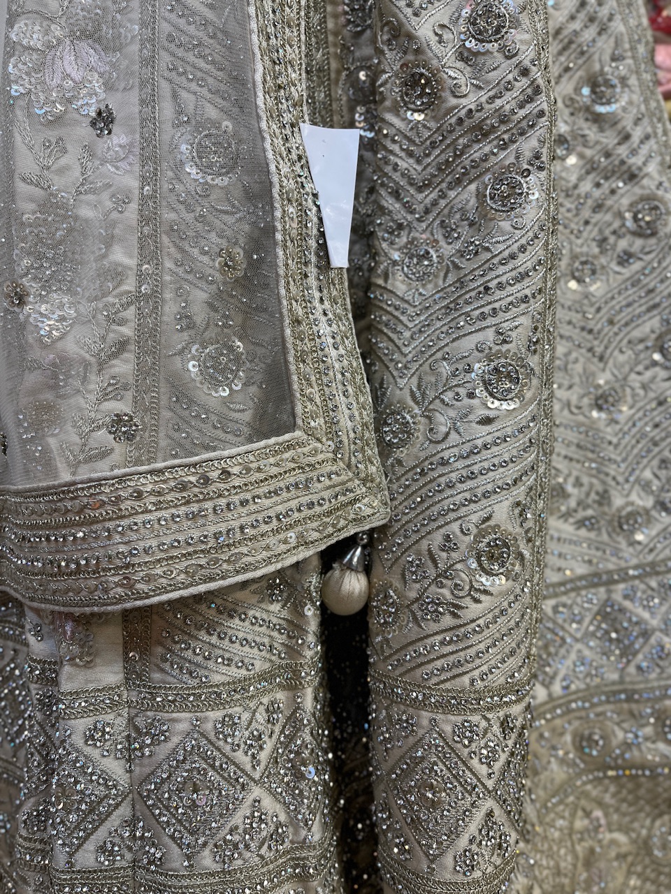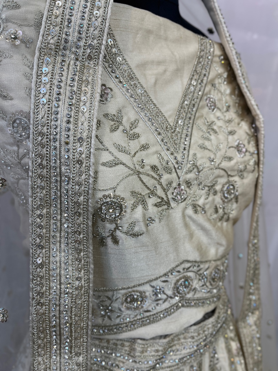 "Embrace royalty and tradition with this exquisite lehenga choli set! Showcasing opulent gold and silver embroidery on a richly hued skirt and blouse, the intricate patterns blend florals and geometry to create a masterpiece. Paired with a sheer dupatta embellished with matching gold details, this ensemble is perfect for weddings, festive celebrations, or any occasion where you want to leave a lasting impression. A timeless blend of elegance and grandeur."