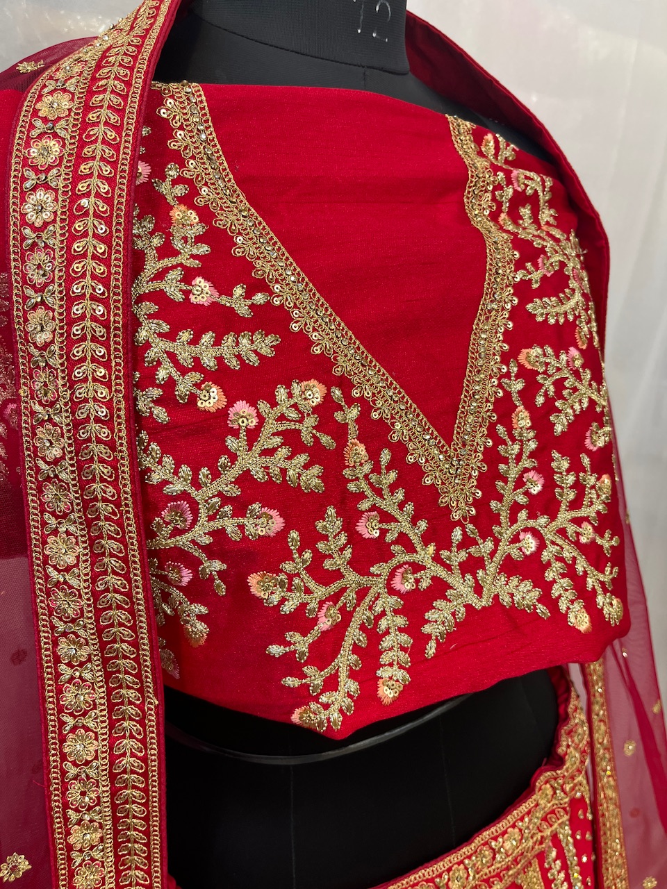 "Immerse yourself in the grandeur of Indian bridal opulence with this stunning red lehenga choli. Crafted in sumptuous fabrics, the ensemble features intricate gold embroidery showcasing floral and geometric patterns that echo timeless elegance. Paired with a matching red dupatta adorned with exquisite embellishments, this outfit is a celebration of regal splendor and cultural artistry—a perfect choice for weddings and grand celebrations."