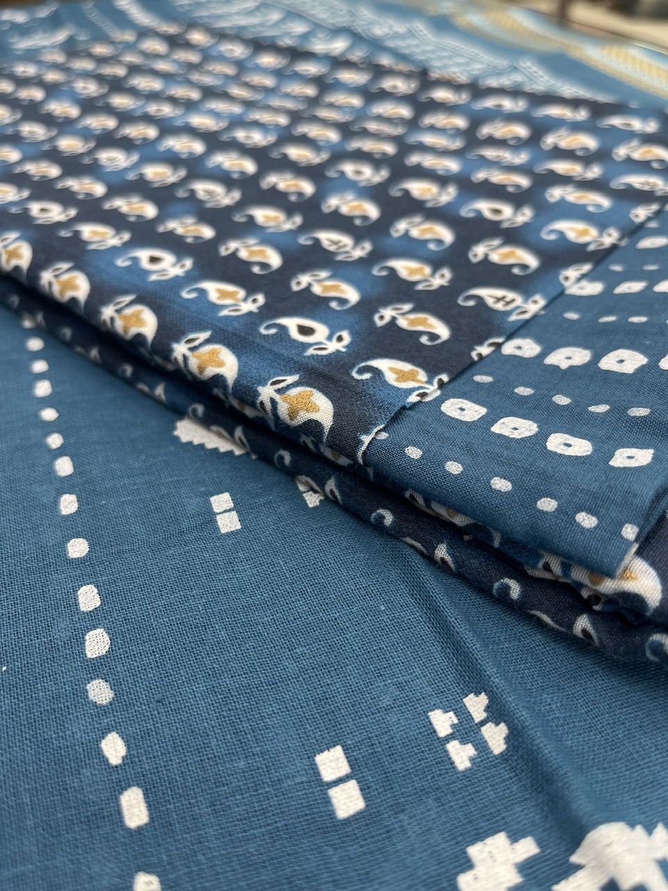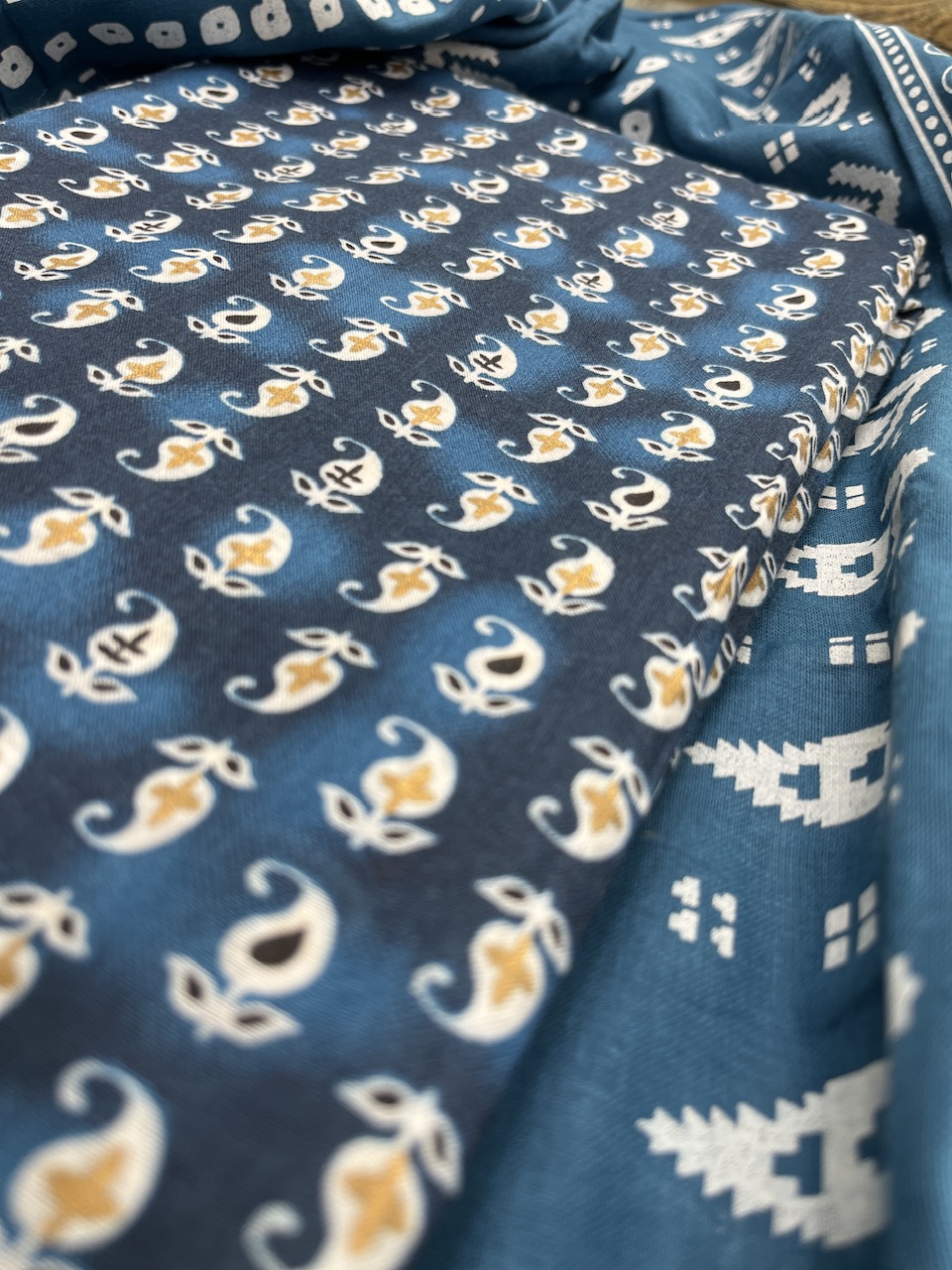 “A breath of tradition in every thread—this printed cotton ensemble marries heritage with comfort. Intricate white motifs bloom across a sunlit blue canvas, while paisley accents on earthy blue lend a grounding contrast. Lightweight, breathable, and effortlessly elegant—perfect for days that ask for grace without compromise.”