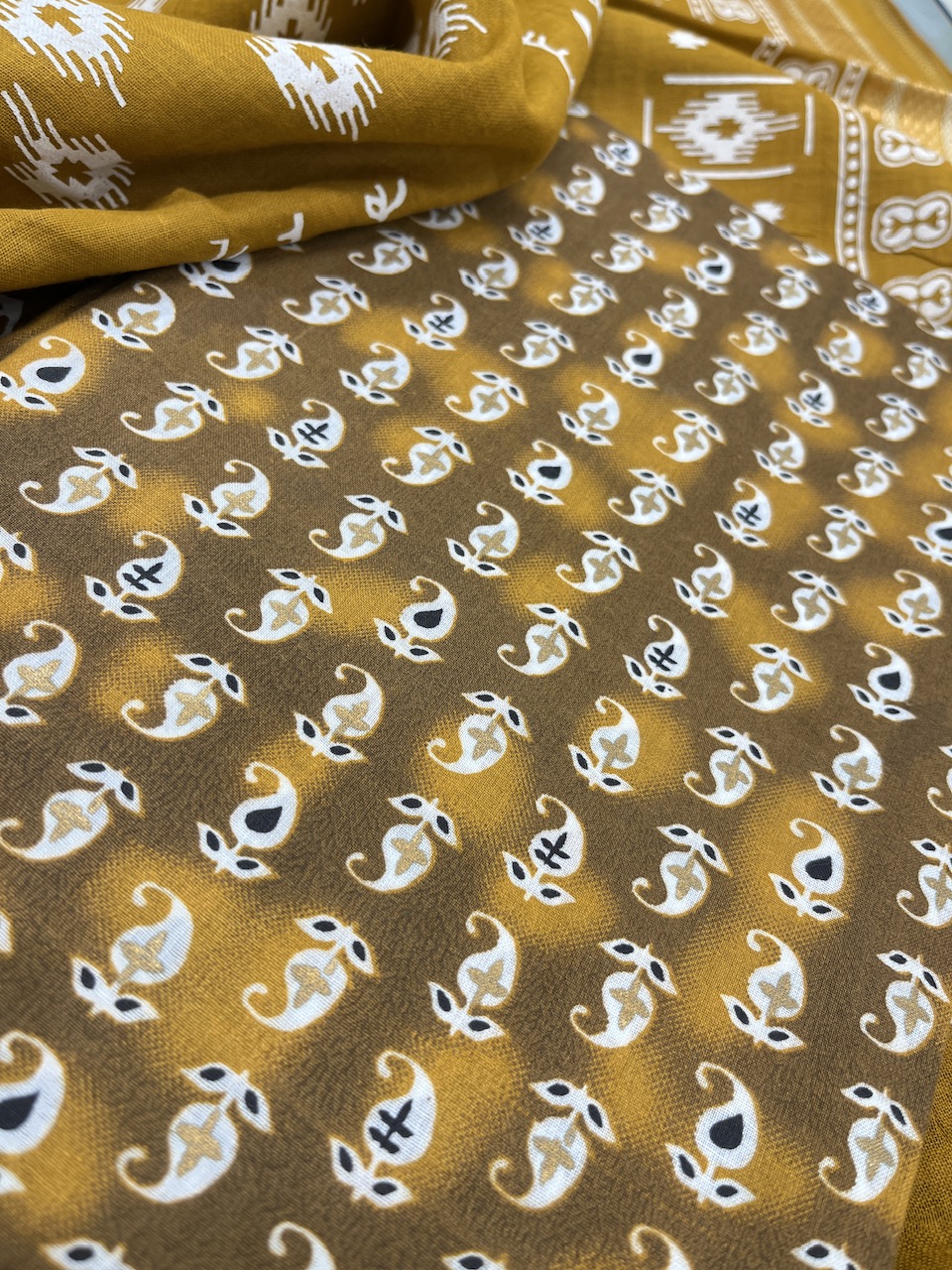 “A breath of tradition in every thread—this printed cotton ensemble marries heritage with comfort. Intricate white motifs bloom across a sunlit mustard canvas, while paisley accents on earthy browns lend a grounding contrast. Lightweight, breathable, and effortlessly elegant—perfect for days that ask for grace without compromise.”