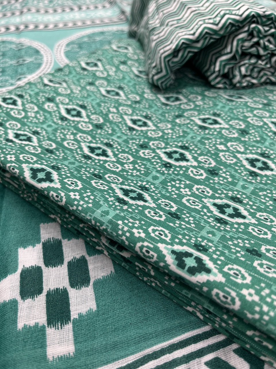 “Geometry in motion, rooted in tradition—this trio of printed cotton fabrics tells a story in patterns. From bold concentric circles to crisp chevrons and delicate diamonds, each motif brings texture and tempo to summer dressing. Crafted for comfort, styled for everyday elegance.”