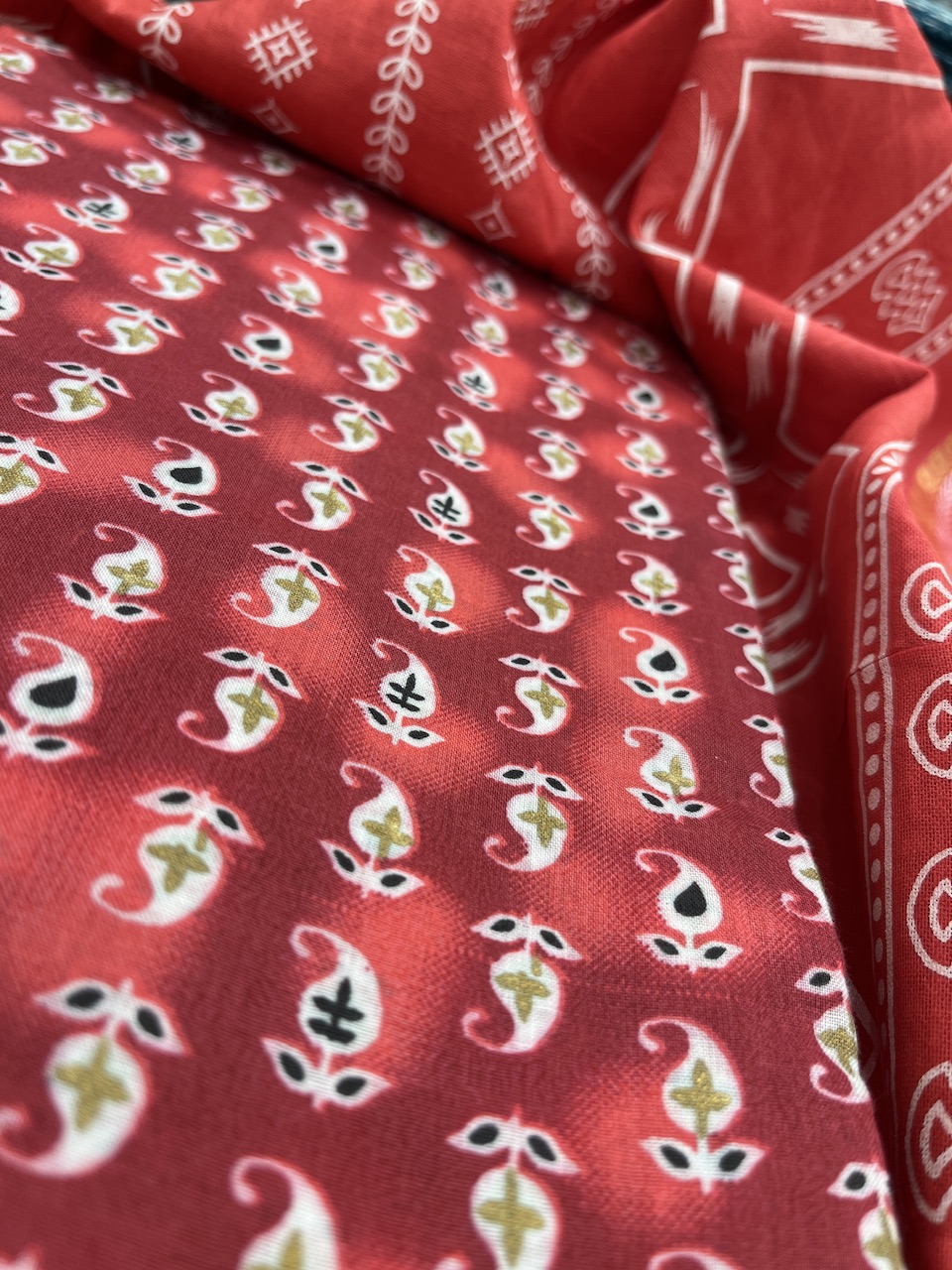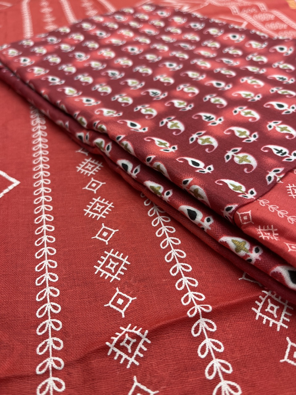 “A breath of tradition in every thread—this printed cotton ensemble marries heritage with comfort. Intricate white motifs bloom across a sunlit red canvas, while paisley accents on earthy red lend a grounding contrast. Lightweight, breathable, and effortlessly elegant—perfect for days that ask for grace without compromise.”