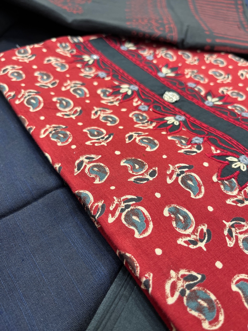"Elevate your ethnic wardrobe with this vibrant dress material, featuring a striking red fabric adorned with intricate paisley and floral patterns. Paired with a sophisticated dark-hued fabric showcasing traditional motifs and subtle stripes, this ensemble beautifully blends cultural artistry with modern elegance."