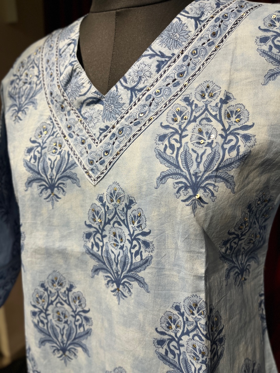 "Step into effortless style with our blue and white kurti, adorned with intricate floral embroidery. Featuring a sophisticated V-neckline and detailed craftsmanship, this kurti is the perfect blend of elegance and charm, ideal for casual outings and semi-formal occasions."