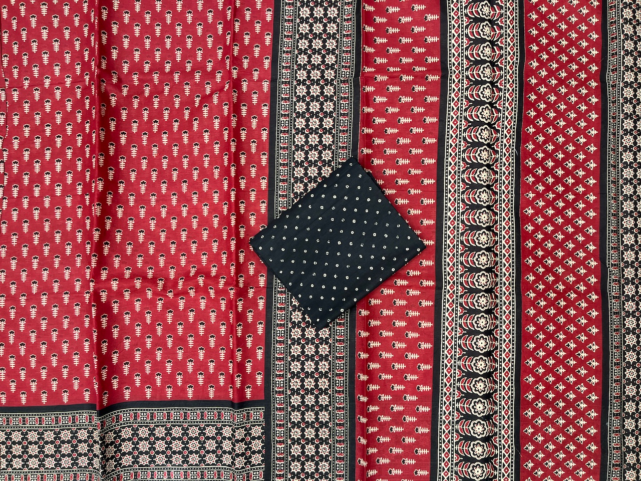 This striking cotton silk Patola ensemble speaks volumes through its rich red body, animated by delicate black and white floral motifs. The drama of the design intensifies with a black border woven in intricate geometric and floral patterns—layering depth and tradition with every inch. Paired with a black blouse piece adorned in white dotted grids, it’s a versatile expression of heritage reimagined.