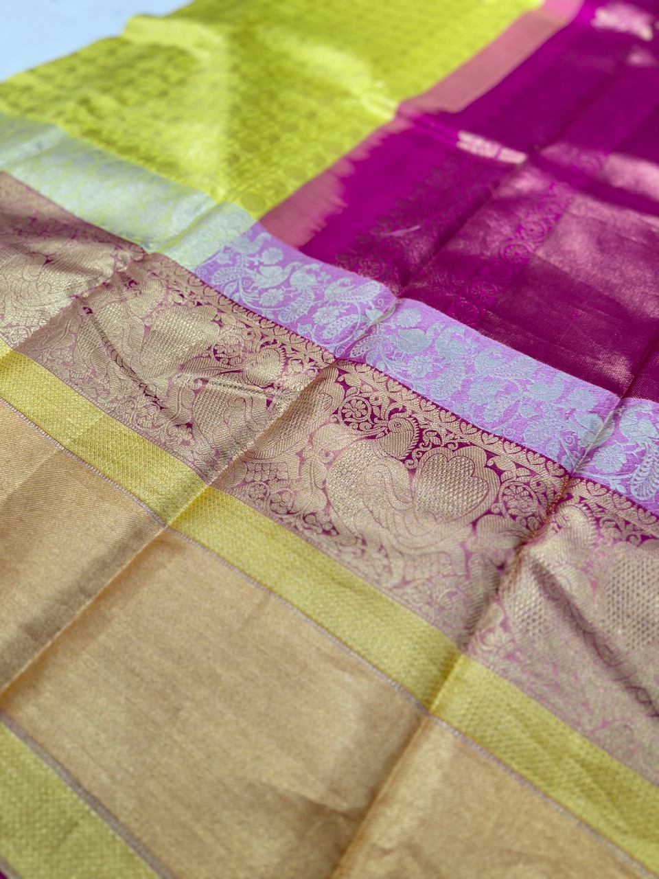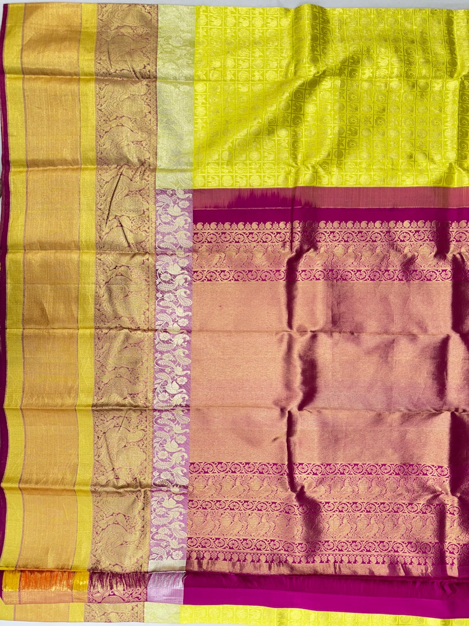 Pure Handloom Kanjivaram Silk Saree with full zari weaving and an exquisite peacock border.