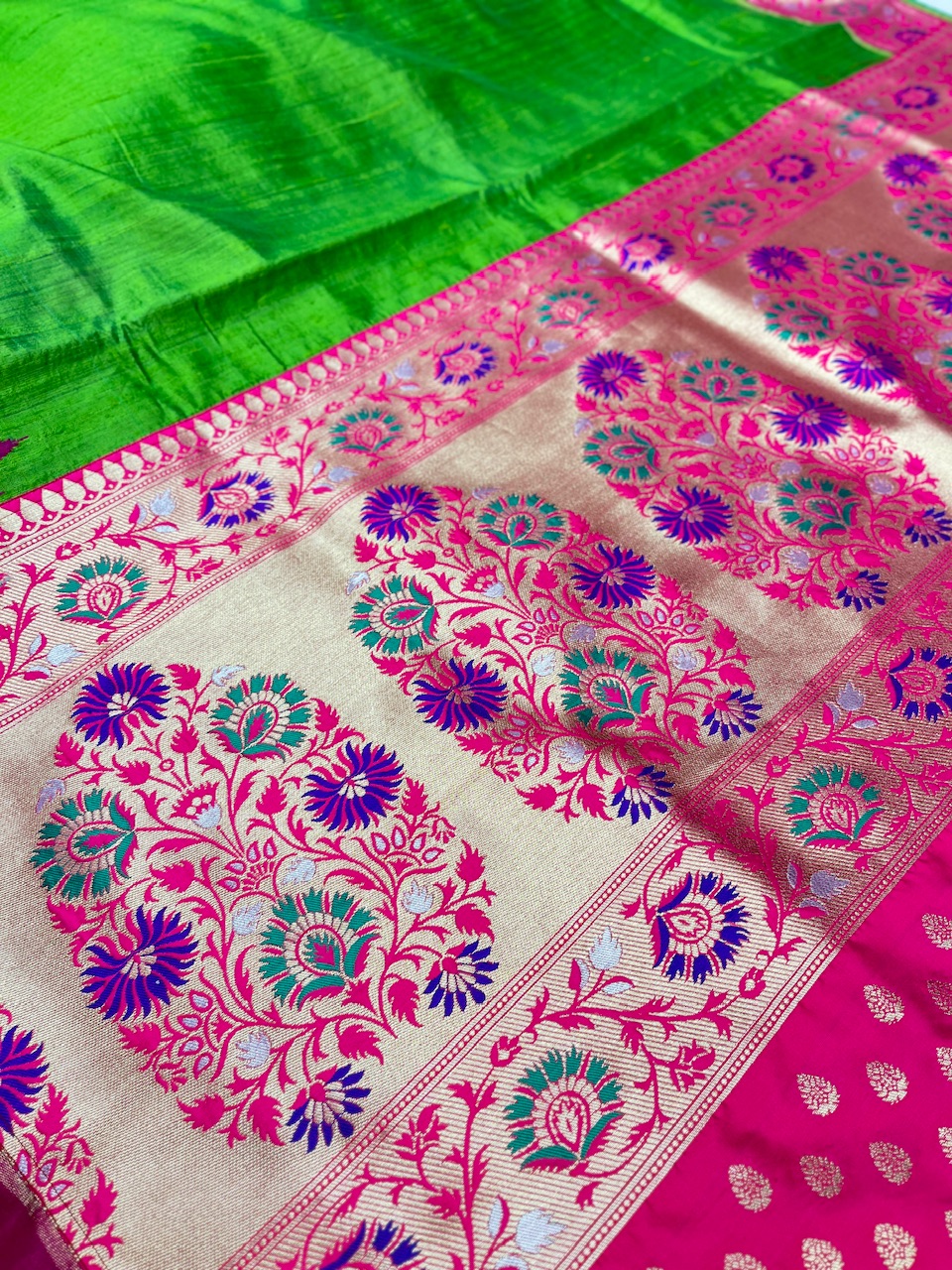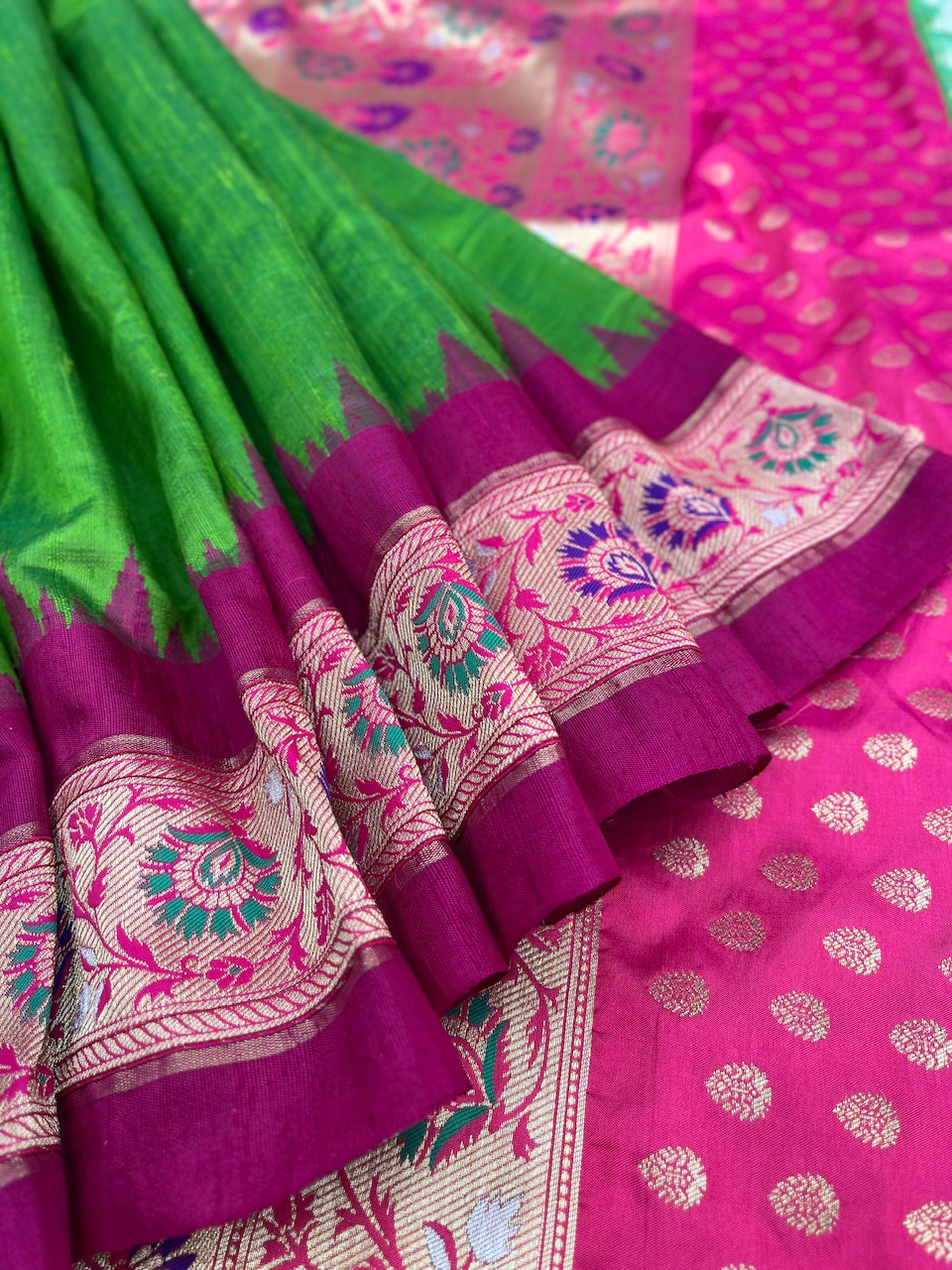 Pure handwoven Matka silk saree featuring a stunning Banarasi border and pallu.