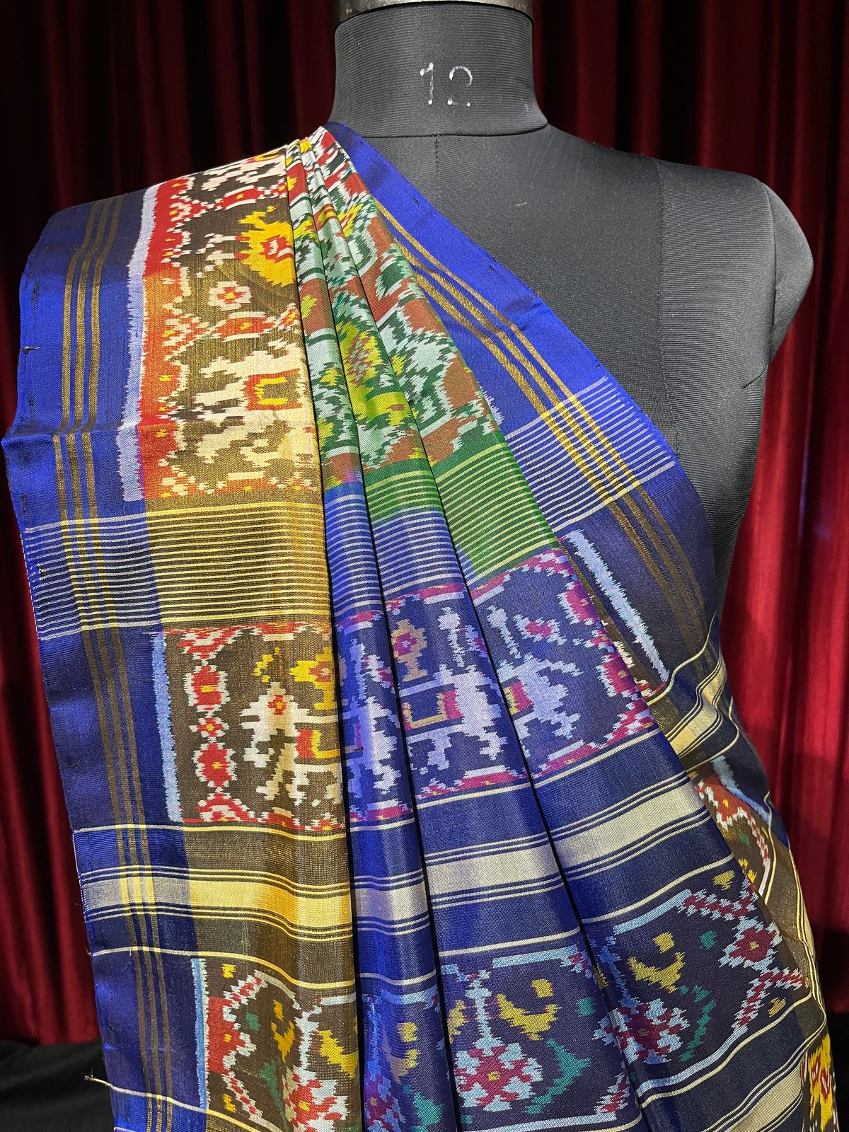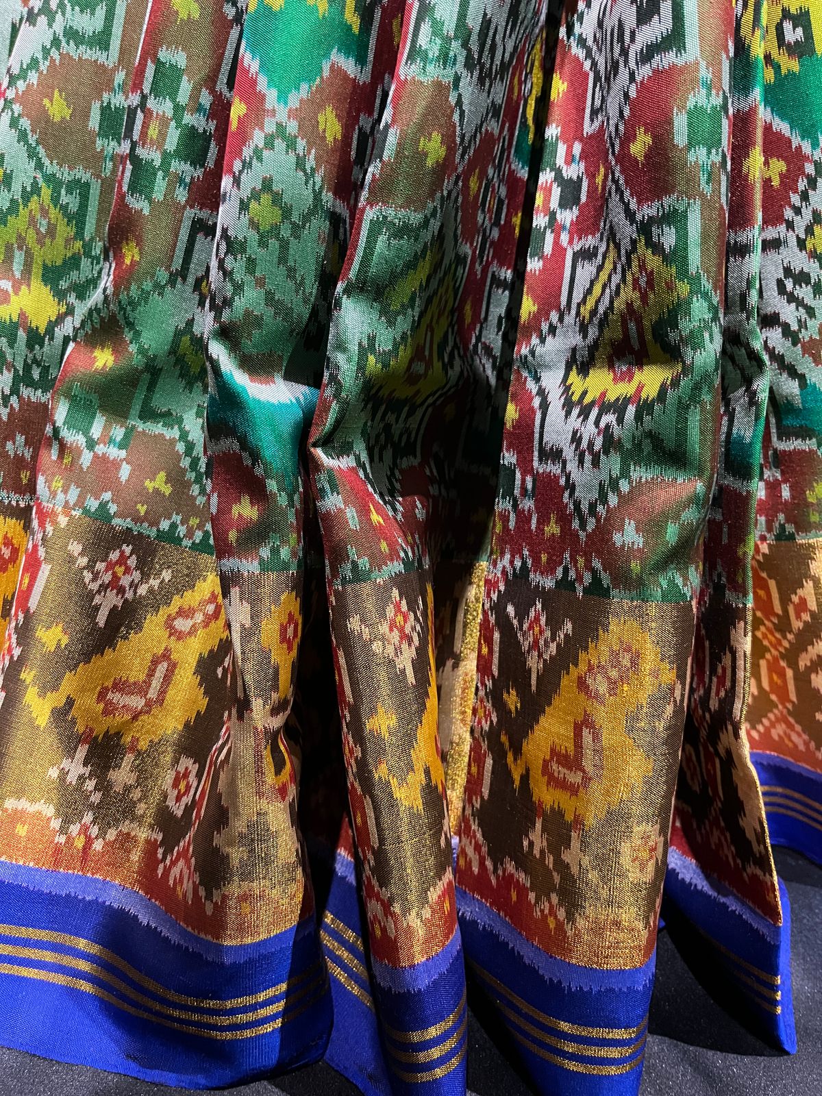 Pure rajkoti patola saree with a combination of blue and green. 100% handloom with the motives of narikunj.