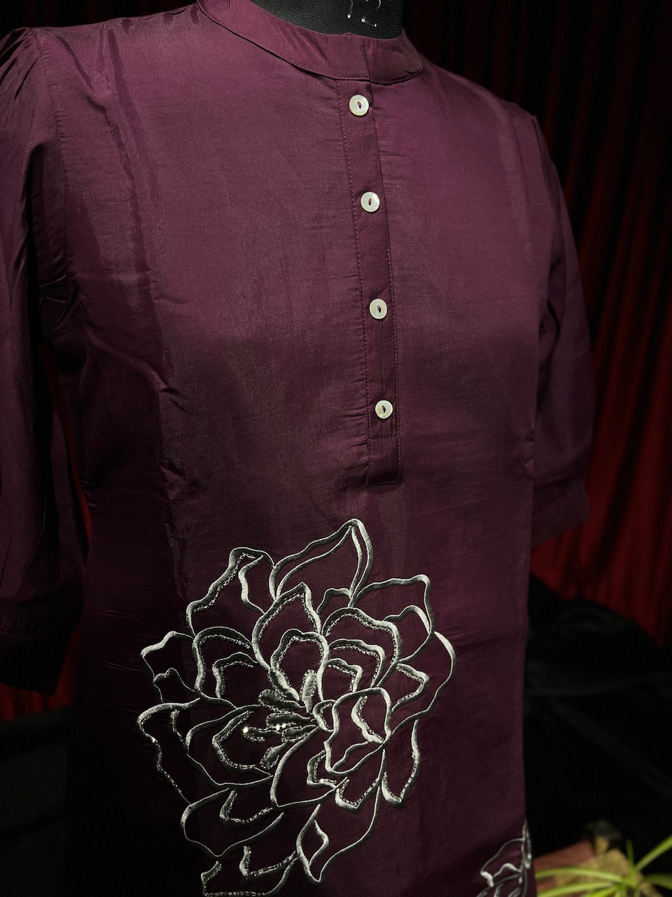 "Step into timeless elegance with our purple cord set, adorned with delicate white floral embroidery. Featuring a mandarin-collar top with a button-down design and matching floral-embroidered pants, this outfit seamlessly blends sophistication with style—perfect for any occasion."
