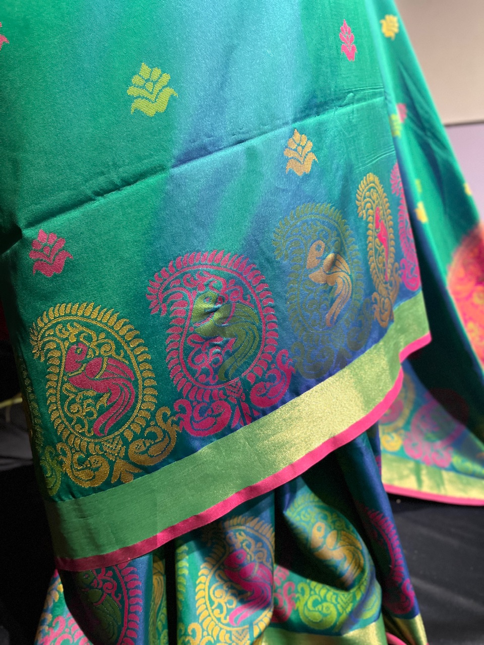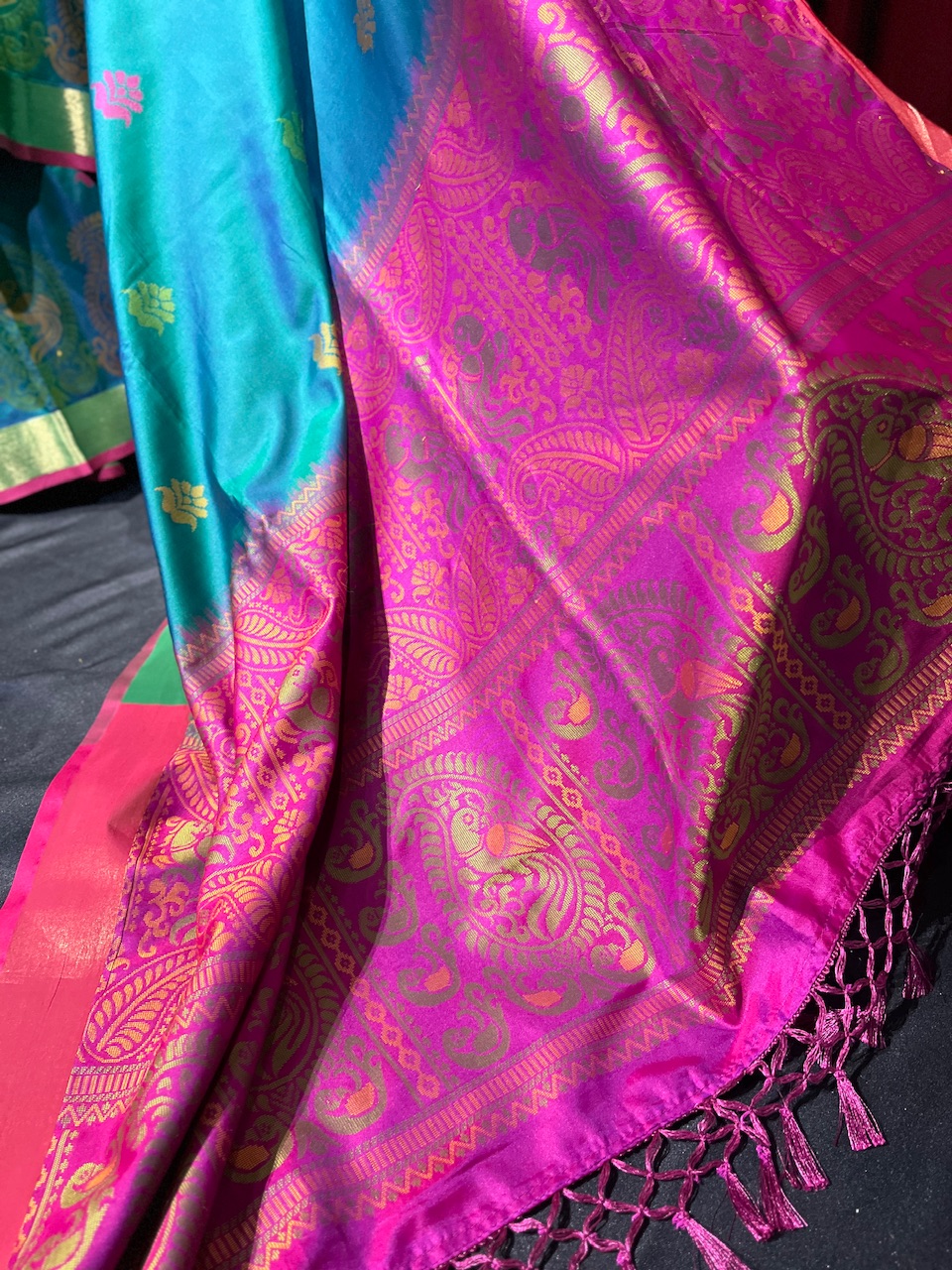 "Radiant green and blue silk saree with exquisite golden and pink motifs—A harmonious blend of tradition and elegance for festive celebrations."